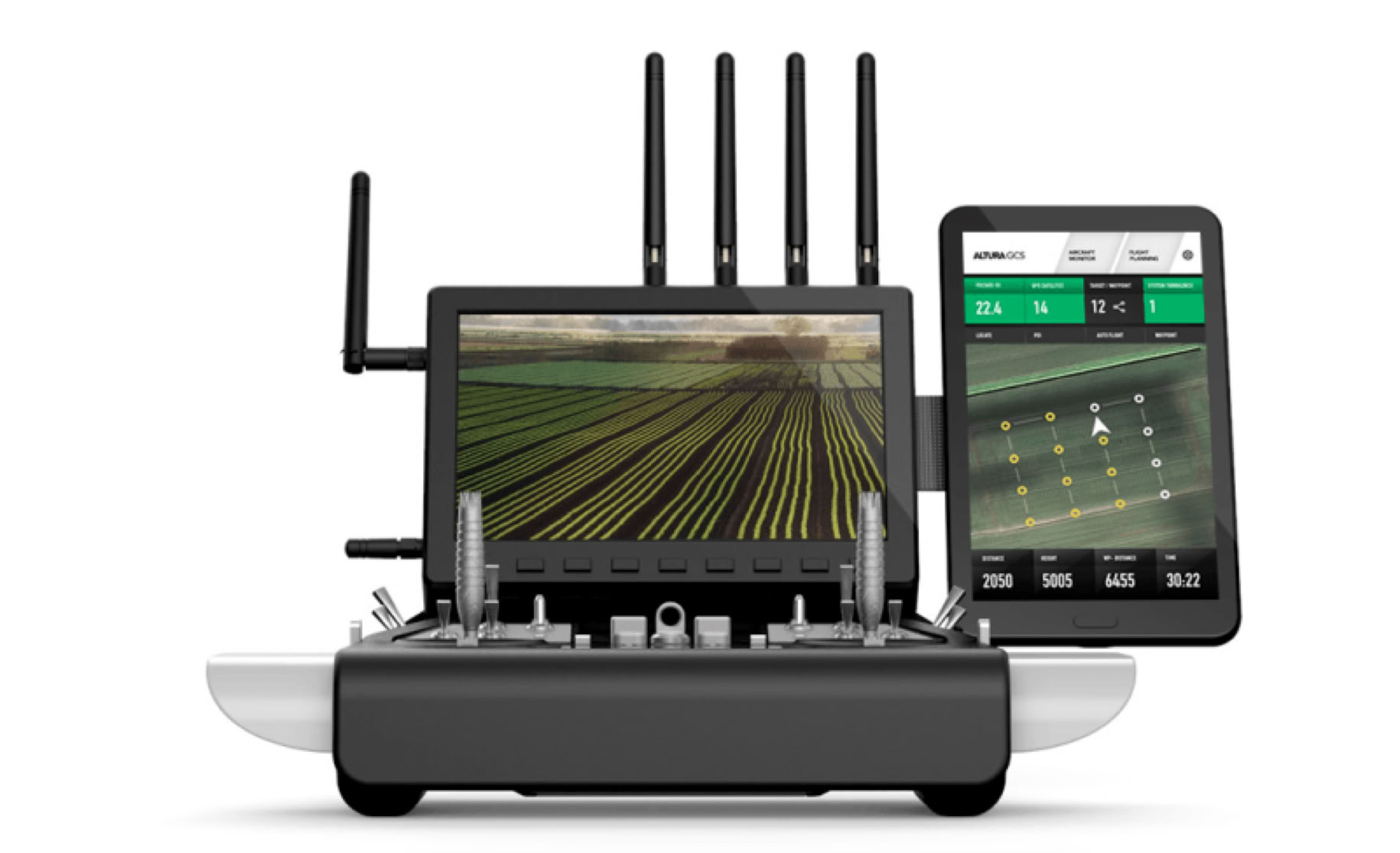 The Altura Ground Control System (GCS) is one of a kind. All of its capabilities are featured on a simple overview to facilitate the control of the entire system. The pilot can manually control the position of the system and operate its payload with unparalleled ease. On an elegant tablet attached to the GCS the pilot operates our in-house app for autonomous navigation, waypoint triangulation and repetitive flight patterns